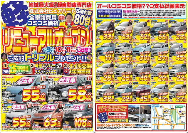 約400坪の敷地には地域最大規模の中古車、約60台を展示しております。軽自動車を中心にミニバン・SUV・輸入車まで幅広く販売しています!